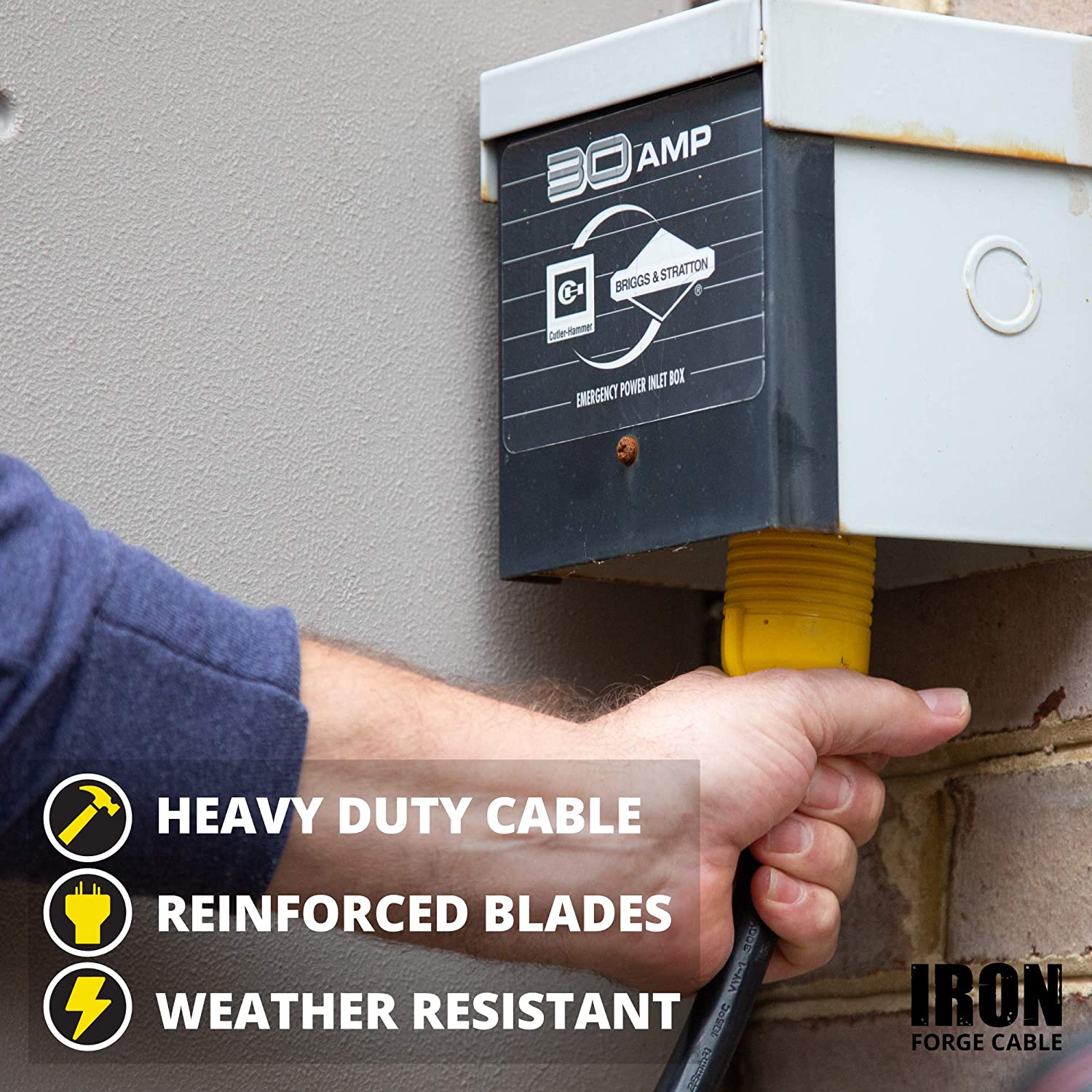 This weatherproof generator power cord will help you stay prepared for any situation, whether it's for a mass power outage or a fun camping trip. Multiple lengths available to reach your transfer switch from your generator.