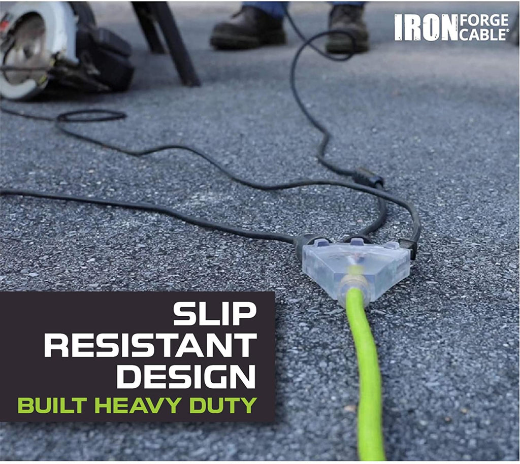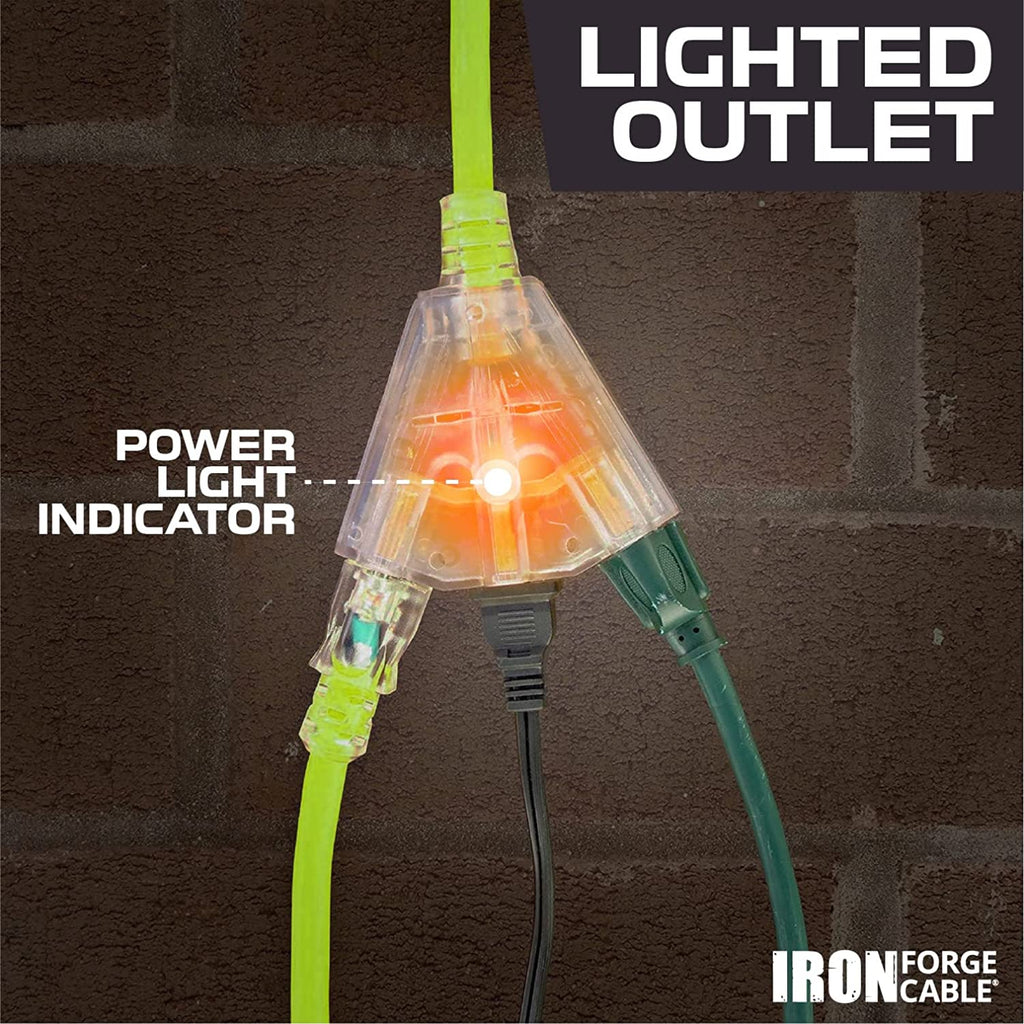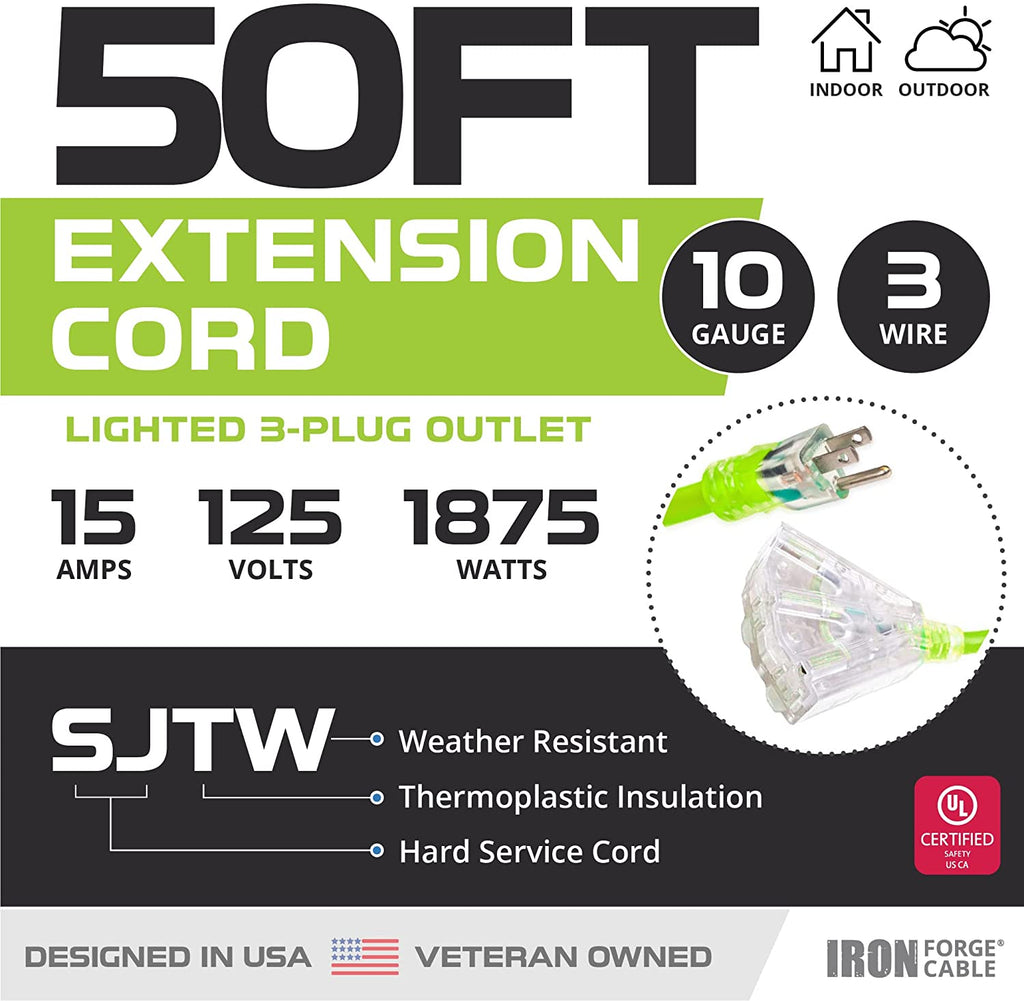 50 Ft Outdoor Extension Cord-3 Outlets-10/3 Neon Green -10 Gauge-3 Prong Plug