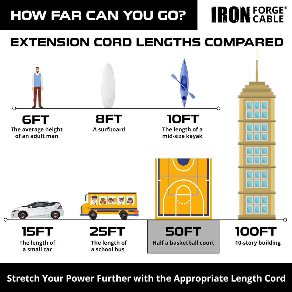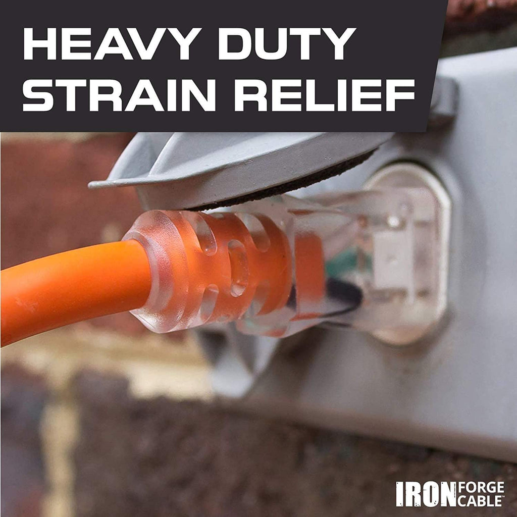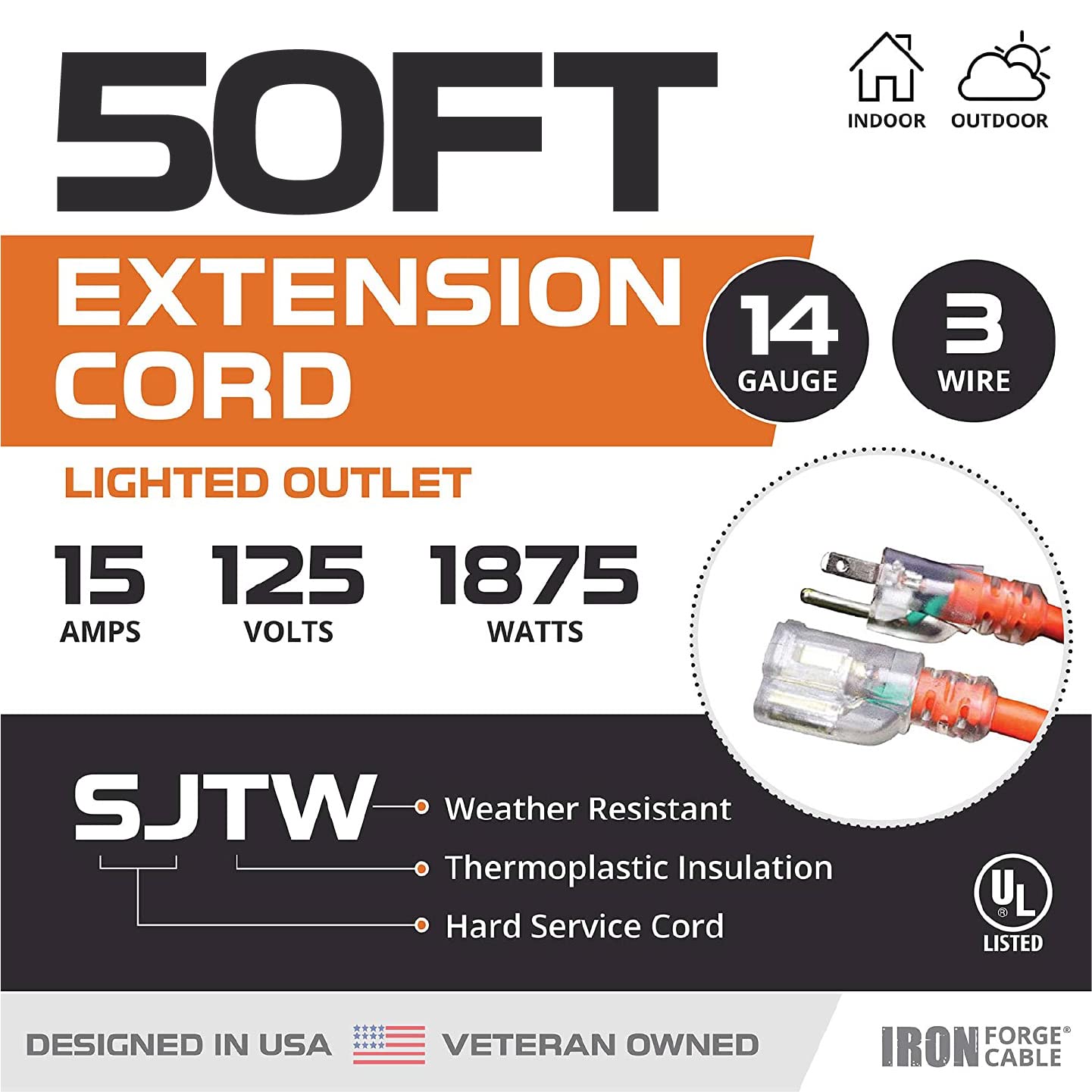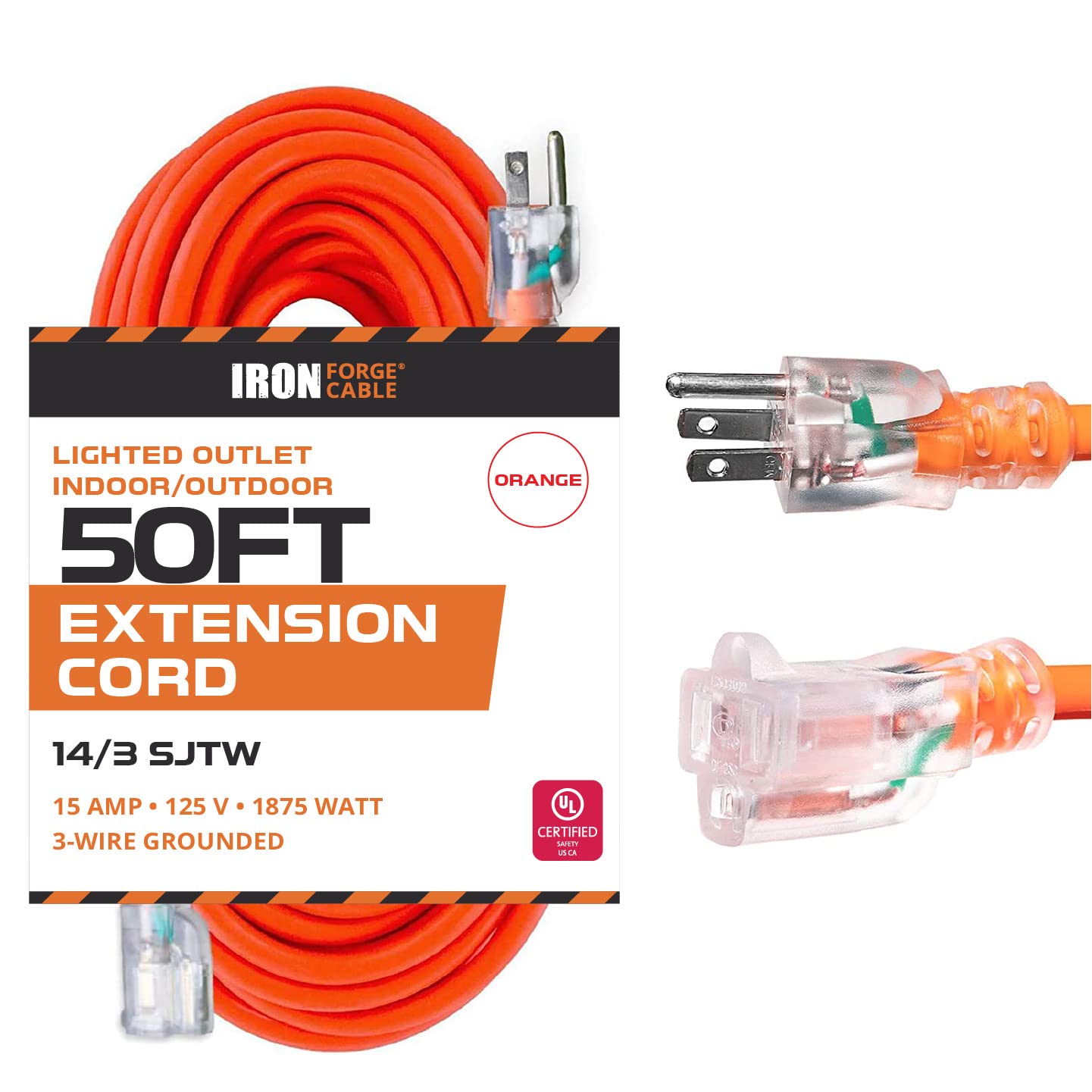 Iron Forge Cables Outdoor Extension Cord is the perfect all-purpose power cord for your indoor and outdoor electrical needs. The heavy duty 14 gauge wire can handle everything from power equipment to everyday appliances. The lighted outlet makes it easy to see, even in the dark. And the cords length gives you good reach across your garden or home. UL Certified. Whether you want to power a leaf blower, lawn mower, pressure washer, weed whacker, electric drill, power saw, or even Christmas lights, this extension cord is designed to meet all your outdoor needs. The vinyl covering protects the cable against moisture, abrasion, and sunlight. The cords orange color is highly visible for extra safety. And the plug offers reinforced prongs that wont bend or break when you use them.