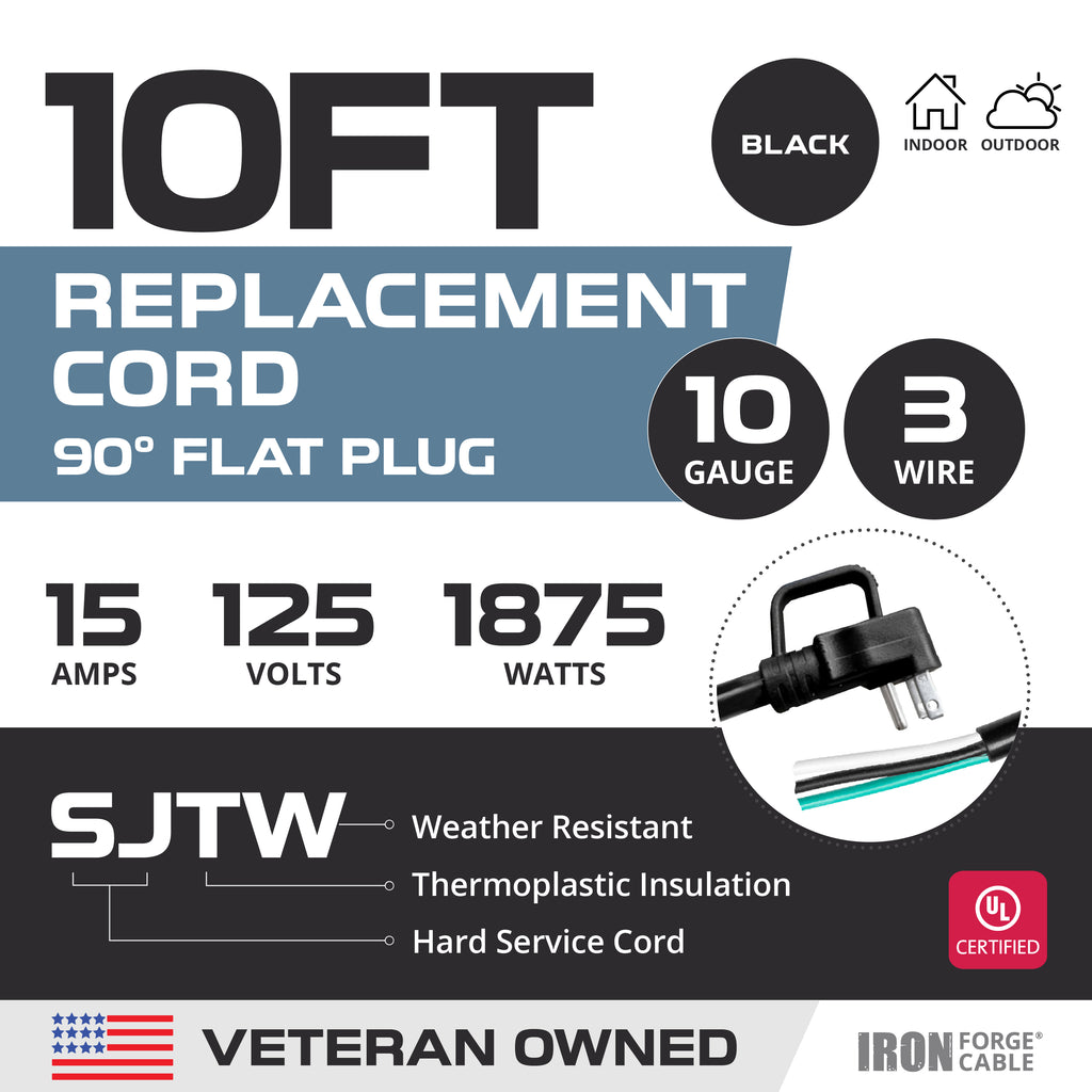 Iron Forge Cable Flat Plug 10 Gauge Power Cord Replacement - 10ft,15 Amp Black Heavy Duty, 10/3 SJT 3 Prong Cable for Appliances & Power Tools